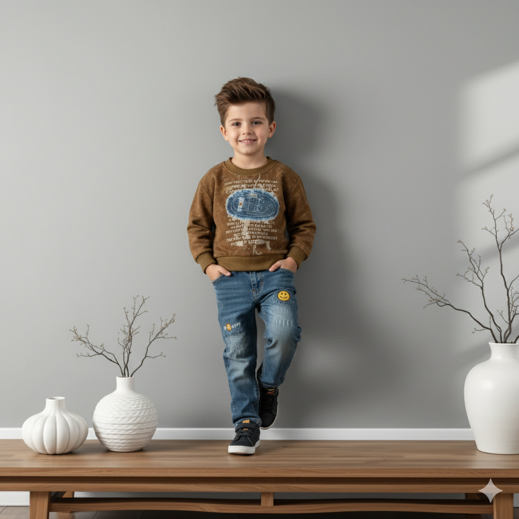 Trendy boys’ brown t-shirt with denim 2 piece set. A stylish kids outfit perfect for casual wear, outings, and everyday fashion.