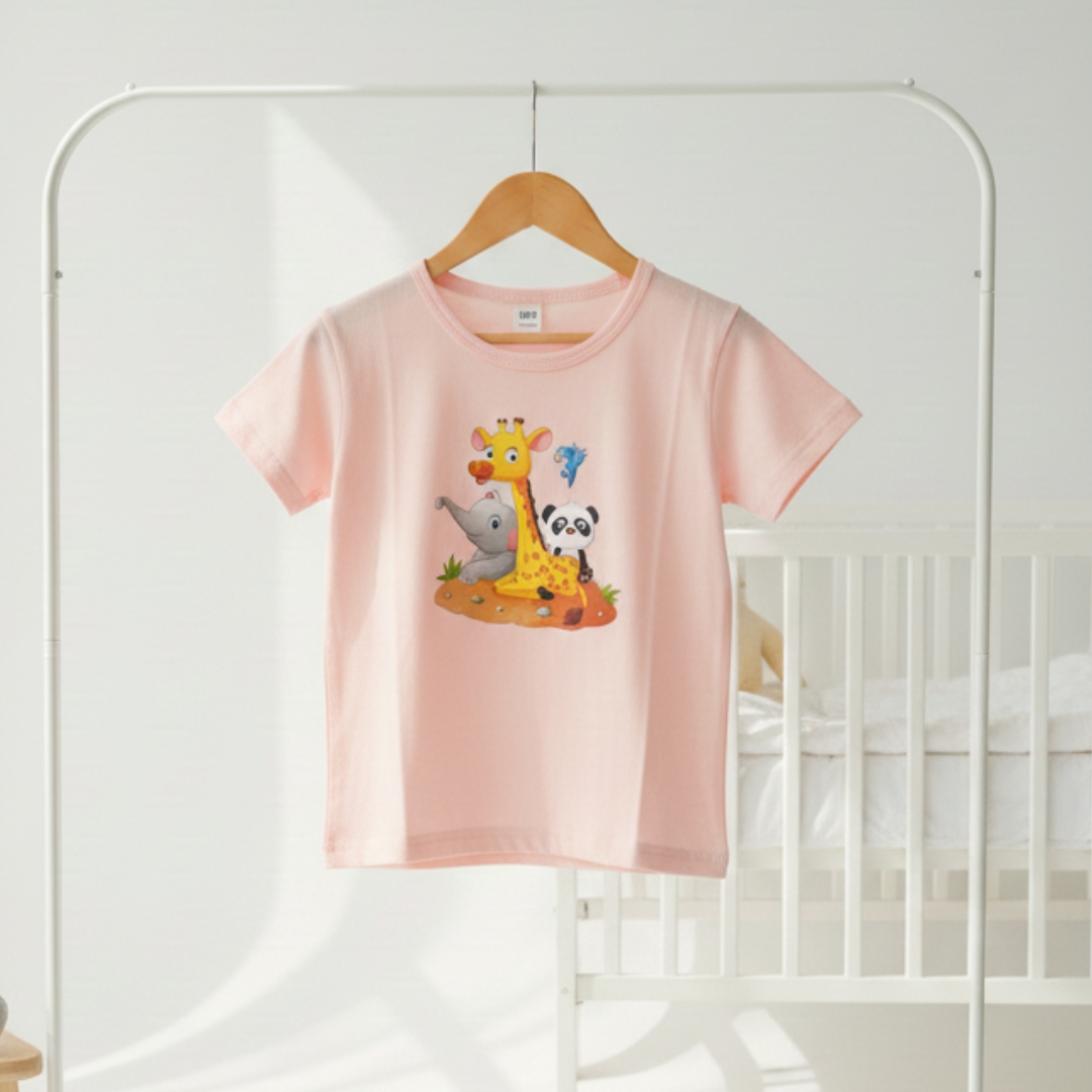 The short-sleeve crewneck T-shirt is crafted from a soft, breathable cotton-blend fabric that is ideal for hot weather. It showcases a large, friendly animal graphic (e.g., a cheerful lion, a sleepy bear, or a group of jungle friends) on the chest, making the shirt fun and engaging for kids.