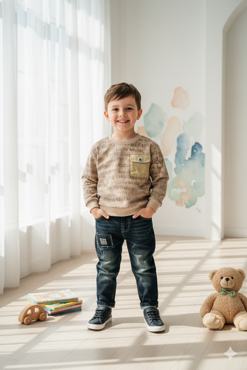 Give your little one a cool, modern look with this two-piece outfit. It features a dark grey sweatshirt with a stylish “Lucky Mistar” print and a small pocket detail, paired with comfortable, denim-look joggers. This set is perfect for playdates, school, or any casual outing.