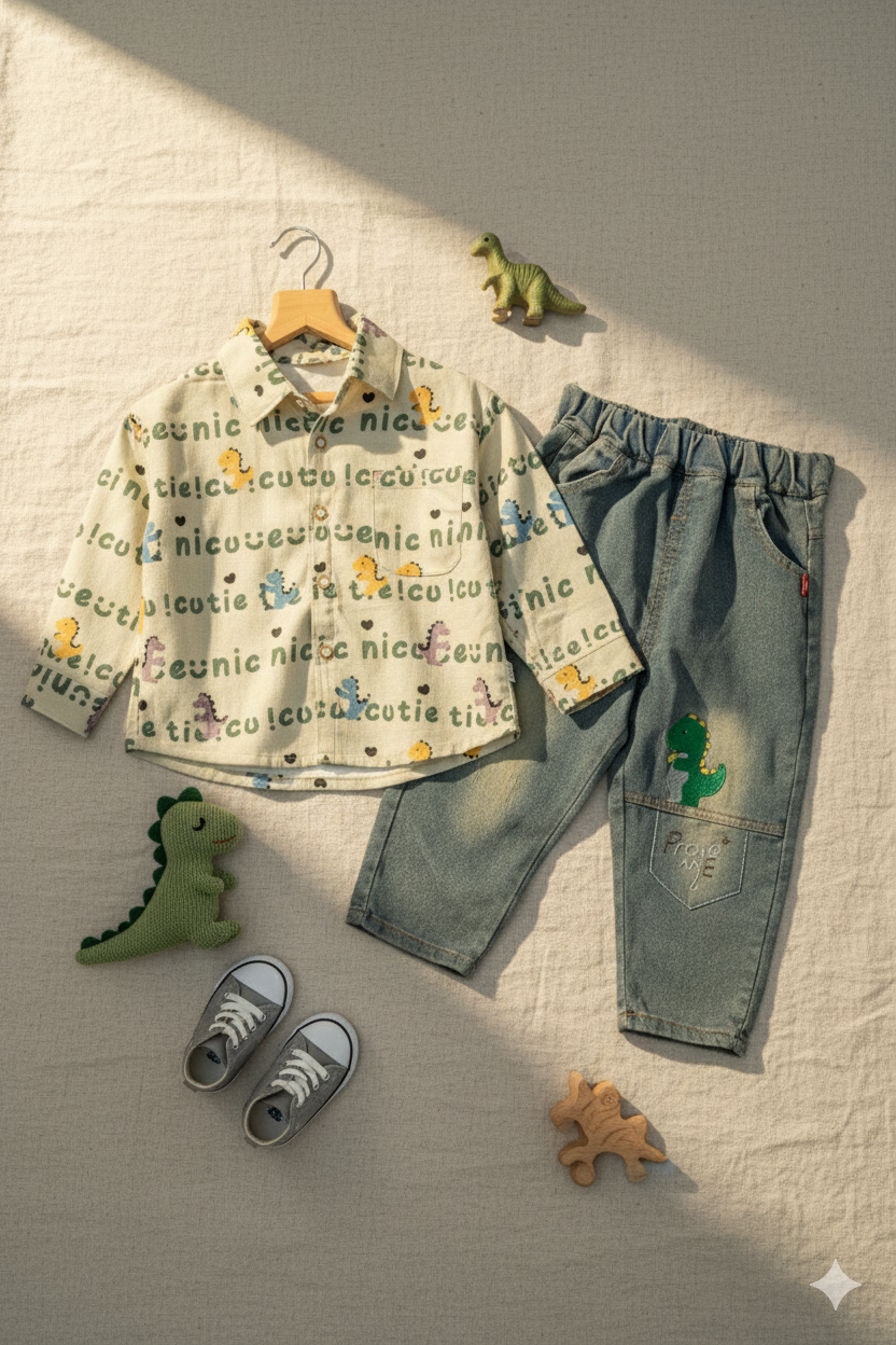 Unleash the fun with this delightful Dinosaur Print Shirt and Denim Pants Set, designed for comfort and endless adventure. This outfit provides a perfect balance of playful style and all-day wearability for your active toddler.
